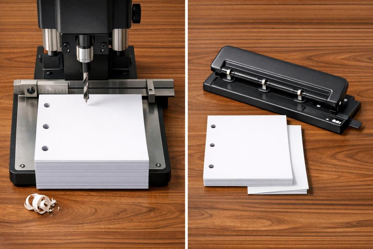 Understanding these distinctions will help you select the right method – whether it’s a simple desktop punch for filing or professional drilling for larger production needs.